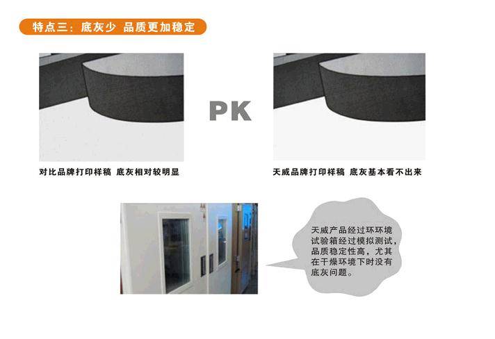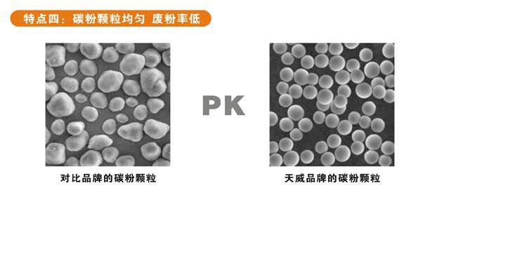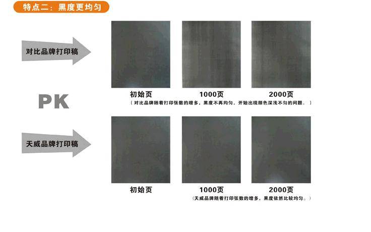 1、打印定影牢固,文字不易擦落。打印清晰度高,底灰小; 2、碳粉顆粒小,不易磨損加熱輥及感光鼓,文稿更加清晰; 3、與原裝碳粉相容性好,可填充碳粉平均可達(dá)3次以上,大大降低使用成本; 4、打印黑度好(1.4以上); 5、天威碳粉的熔點(diǎn)范圍寬,碳粉成份與硒鼓及打印機(jī)配合較好,使用在不同的打印機(jī)上,都不會(huì)粘結(jié)定影輥,打印的文稿定影牢固,清晰亮麗,可以讓您放心使用。 |